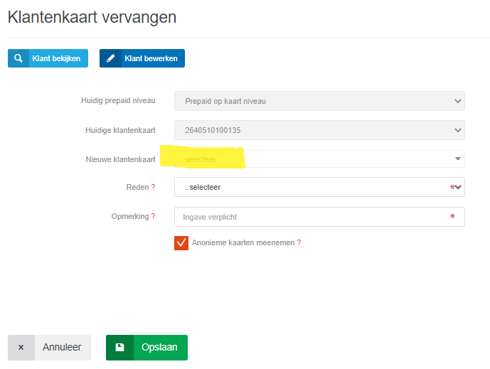 Door het vervangen van een klantenkaart krijgt de klant een nieuwe klantenkaart. De nieuwe klantenkaart zal een ongeregistreerde pas zijn met hetzelfde prepaid niveau.