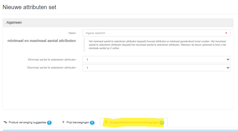Het minimaal aantal te selecteren attributen bepaald hoeveel attributen er minimaal en/of maximaal geselecteerd kunnen worden. Dit betekend welke hoeveelheid er gekozen kan worden voor een artikel in een attributen set op de POS.