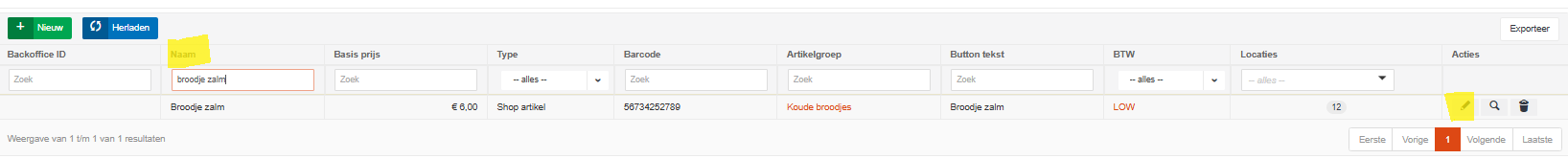 4. Klik in het vakje onder "Naam" en zoek naar de artikelgroep waar het artikel onder valt. Klik aan de rechterkant op het potlood om het artikel te bewerken.