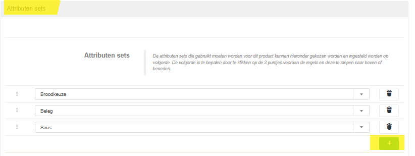 17. Klik aan de rechterkant in het vak "Attributen sets" op de groene plus en selecteer de aangemaakte attributen set.