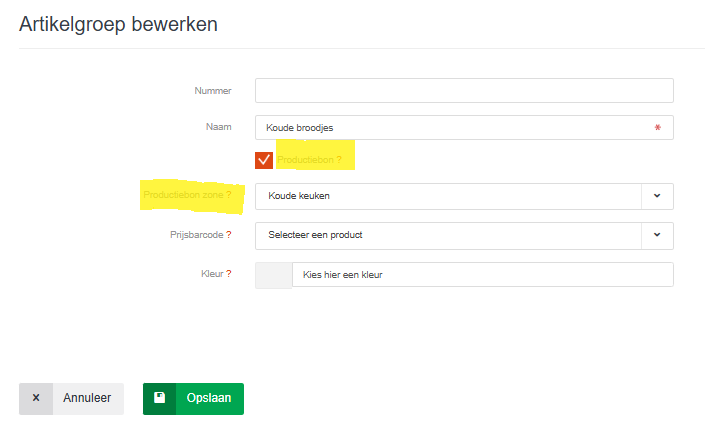5. Zet het vinkje bij "Productiebon" aan. Van de artikelen in deze groep kan nu een productiebon worden afgedrukt.